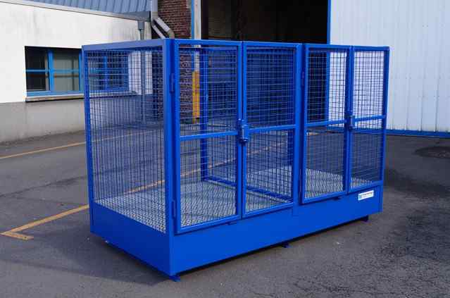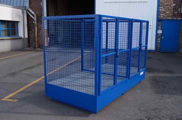 Besoin de box de stockage grillagé fermeture à clé avec bac rétention intégré dimension palette Europe pour des futs plastique de produits de nettoyage 200L