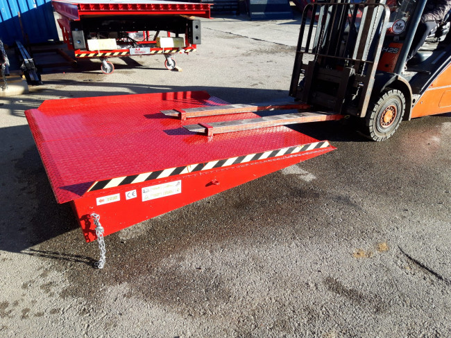Rampe d'accès pour benne posée au sol. Cette rampe est un dispositif essentiel pour faciliter le chargement et le déchargement en toute sécurité. Fabriquée en acier robuste, elle offre une résistance optimale aux intempéries et aux charges lourdes. Son profil incliné en pente douce assure une transition en douceur entre le sol et la benne, minimisant ainsi les risques de chocs ou de dommages aux pneus des engins de manutention. Grâce à sa conception antidérapante, elle garantit l'adhérence nécessaire. En outre, ses bords latéraux relevés procurent une sécurité supplémentaire en empêchant les débordements latéraux et les chutes éventuelles.