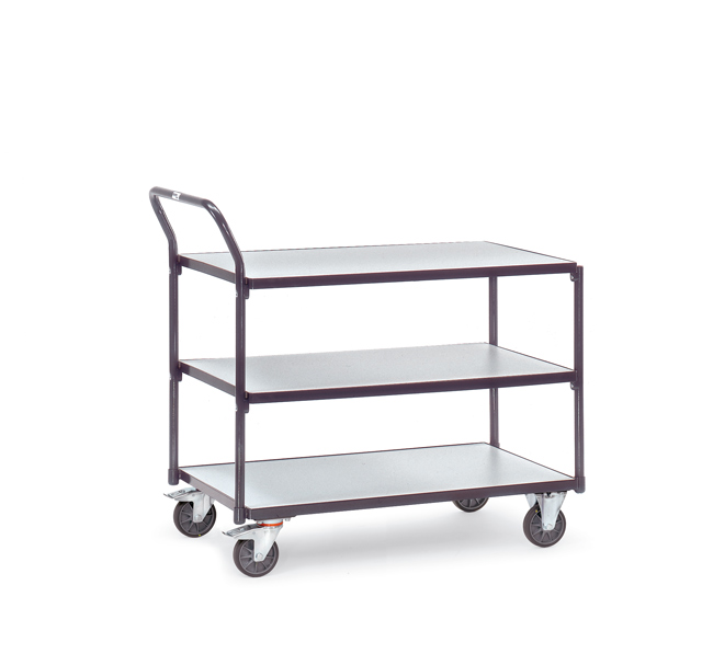 Composé de 3 plateaux gris clair conforme à la Norme DIN 68765 avec rebord de 5 mm et 2 roues pivotantes et 2 fixes à bandage TPE-ESD (Élastomère thermoplastique), conductrices d´électricité, moyeu à roulement à billes de précision.