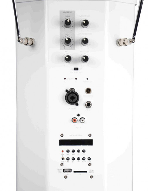 - Amplificateur de 40 watts et haut-parleur intégré, 1 entrée micro, 1 entrée Aux, 1 sortie Line, 1 sortie Rec