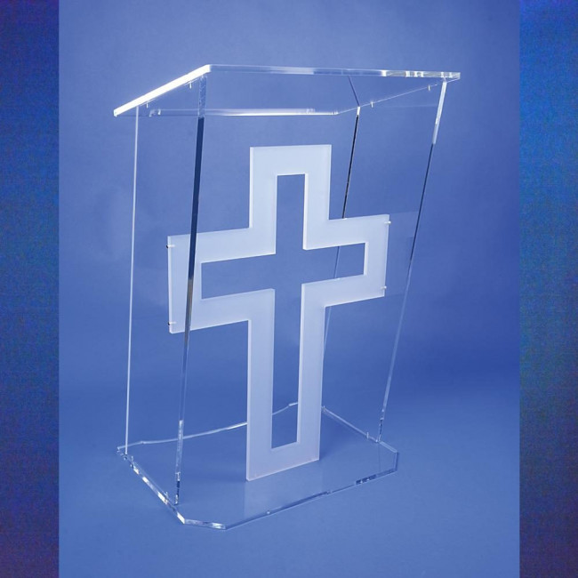 Sa croix évidée en plexiglas dépoli crée un effet givré subtil, tandis que le reste du pupitre reste transparent.