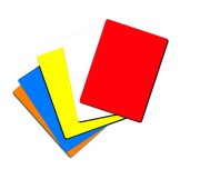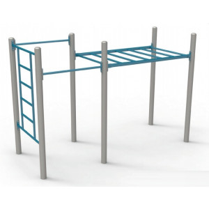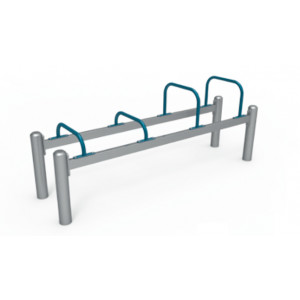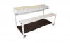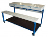 Cette table de marque possède une structure en acier plastifié bleu, un plancher antidérapant en bois.