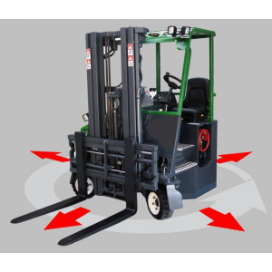 Ce chariot intègre les performances d'un chariot tri-directionnel et d'un chariot à mât rétractable, permettant aux opérateurs de gérer les palettes eux-mêmes, sans avoir à compter sur un personnel supplémentaire.