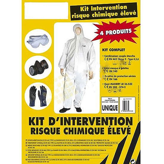 Kit individuel de protection chimique, idéal pour intervenir rapidement et efficacement pour la récupération de fuites et écoulements accidentels de produits chimiques dangereux non identifiés.