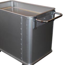 Ce conteneur aluminium fond mobile est équipé de 2 roulettes fixes et 2 roulettes pivotantes.