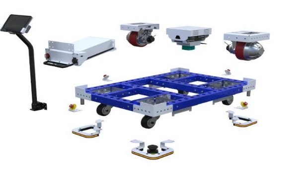 Le système de manutention automatisé est basé sur une architecture modulaire qui permet d'adapter l'AGV à divers besoins : transport de palettes, bacs, chariots ou pièces d'assemblage.