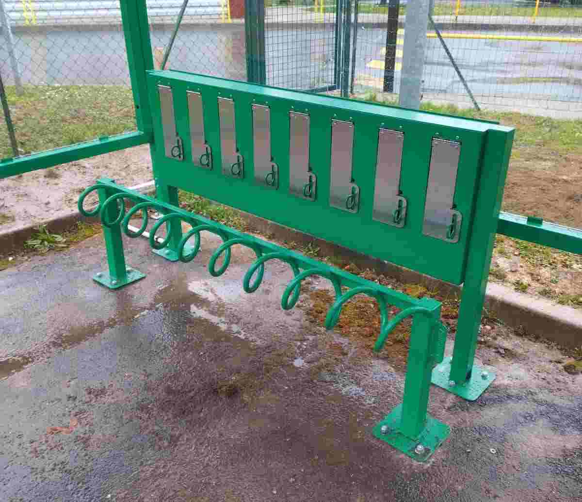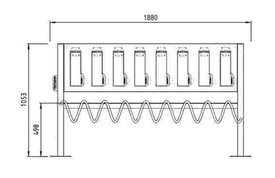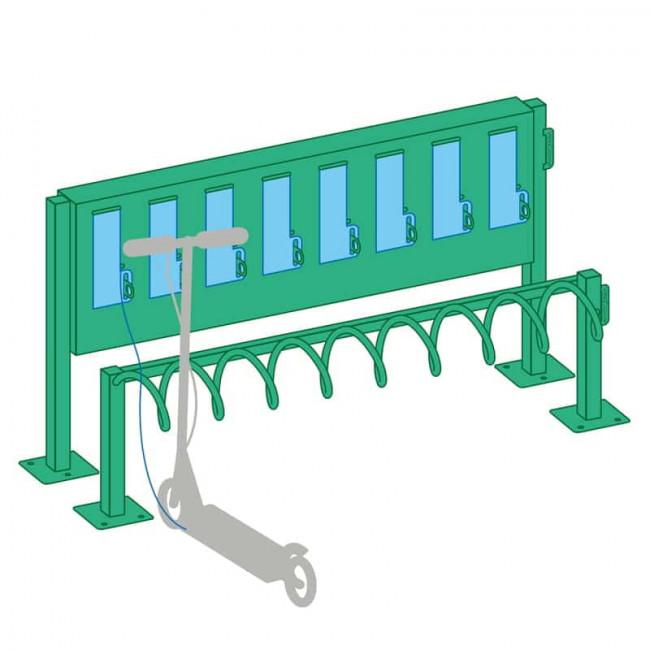 Disponible en version 4 ou 8 places, il permet de sécuriser chaque trottinette grâce à ses spirales et sa barre transversale, tout en offrant une borne de recharge intégrée via des prises étanches IP55.