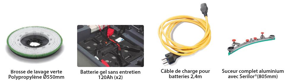 Livrée avec 2 brosses de lavage vertes Ø370 mm, 2 batteries gel 12 V/120 Ah, un câble de charge 2,4 m et un suceur aluminium 1 944 mm avec lamelles serilor, la machine est immédiatement opérationnelle en réception.