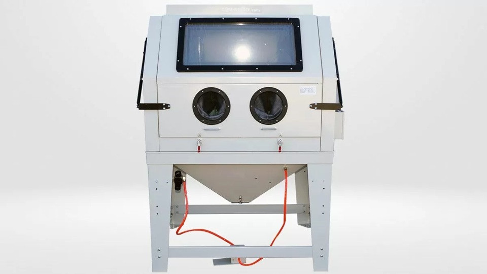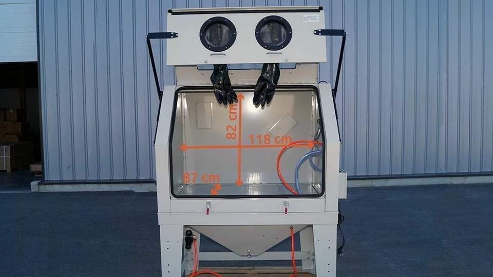 Son ouverture frontale totale facilite le chargement des pièces volumineuses, tandis que le système d’aspiration améliore nettement la visibilité pendant le sablage.