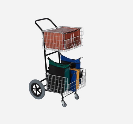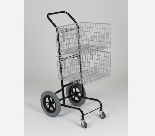 Ce chariot de distribution de courrier allie un grand volume de chargement à deux paniers métalliques spacieux.