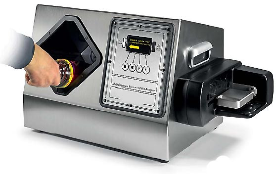 L’opérateur place simplement la bouteille dans la cavité d’inspection ; l’analyse démarre automatiquement sans réglage ni manipulation complexe.