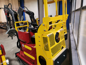 Modèle milieu de gamme de la série Micro Pelle en largeur de 83cm, la Micro Pelle, possède une tourelle tournant à 360° avec un pied de flèche 110° permettant de travailler en déporté (à raz d’un mur par exemple).