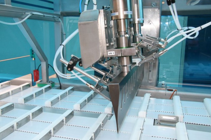 Ce trancheur ultrason est conçu pour couper en tranches équidistantes des produits à longueur variable.