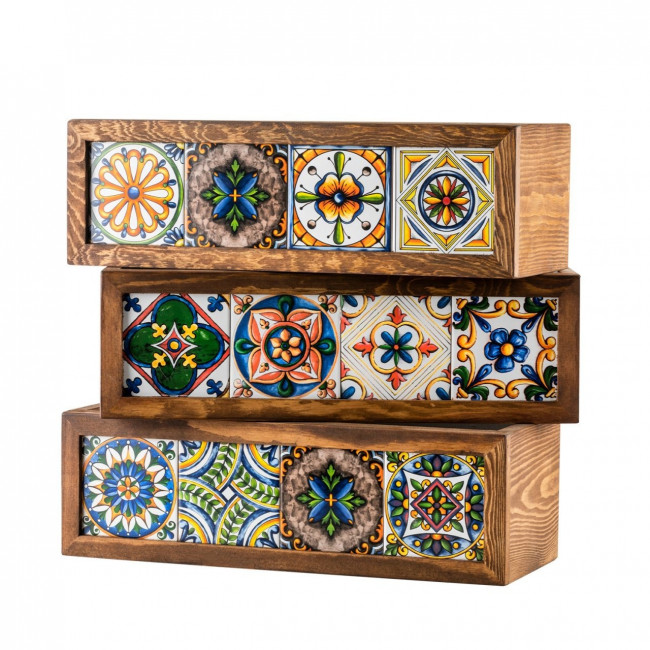 Ces pots de fleur en bois carrelé mexicain incarnent l'union entre la beauté naturelle du bois et les éclats de couleurs des carreaux à motifs mexicains.