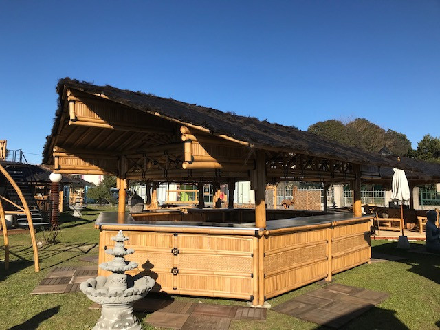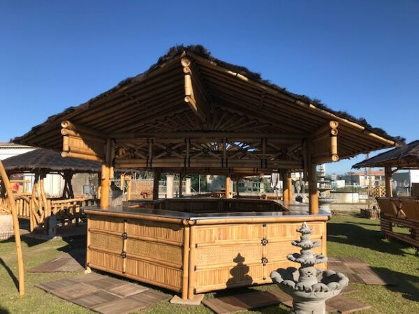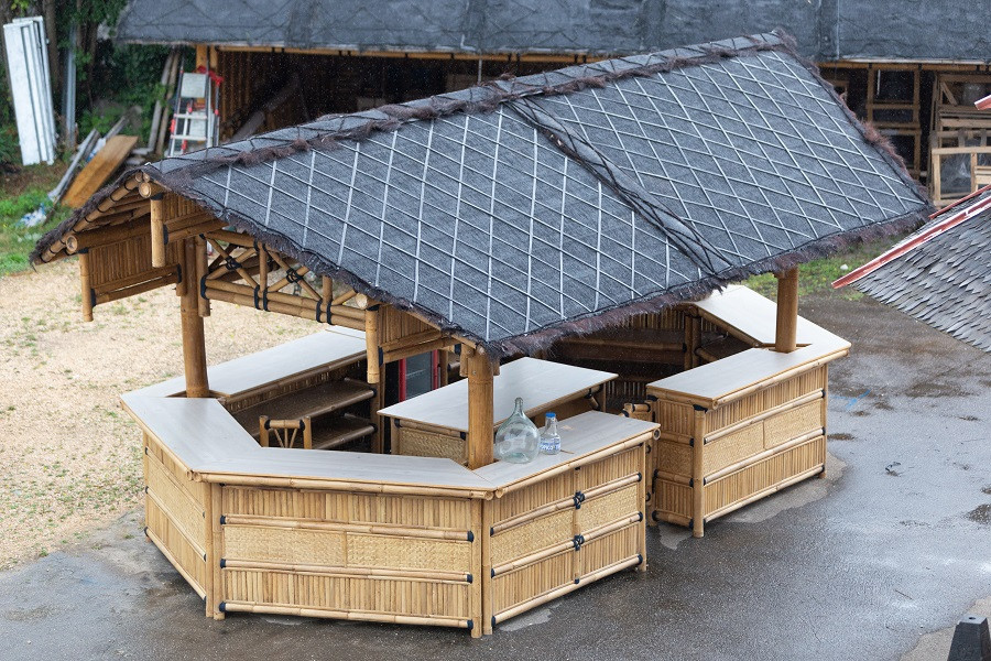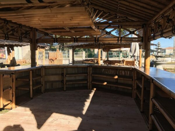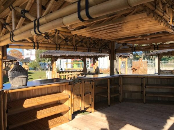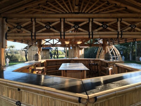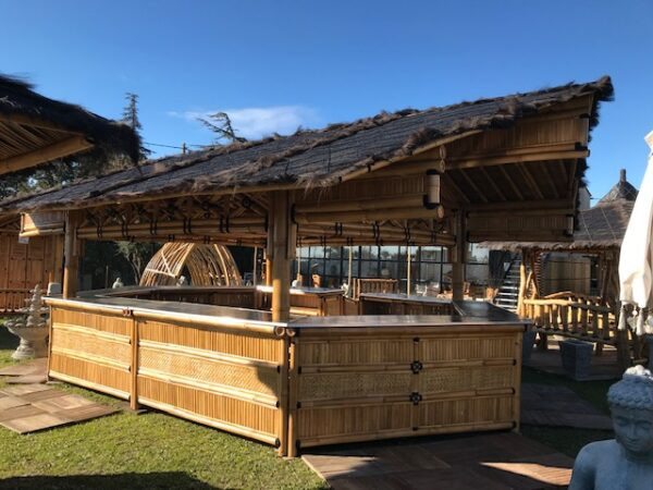 - Sous la toiture est installé un grand porte-verre en bambou ainsi qu’une grande table centrale