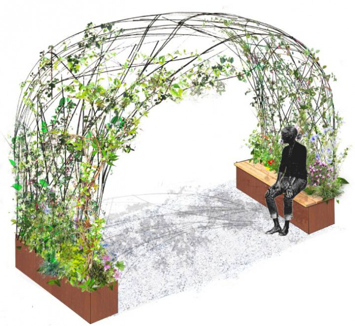 L’arche végétale urbaine accueille les usagers, favorise les pauses et améliore le confort thermique des zones fréquentées.