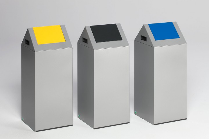 -des poubelles de tri sélectif quatre poste contenance de 60 litres par poste (jaune, vert bleu, gris) à destination des airs recevant du publique.