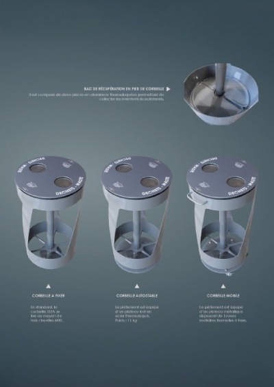 - Les enjoliveurs sont composés d’une flasque d’épaisseur 4 mm et de deux charnières d’épaisseur 6mm. Les enjoliveurs sont de teintes différentes et permettent d’identifier deux zones de tri. Les enjoliveurs sont articulés par un axe monté sur charnières. Lors de leur fermeture, les enjoliveurs sont amortis par deux butées en caoutchouc. La fermeture des enjoliveurs sur les porte-sacs permet de bloquer le sac à déchets.