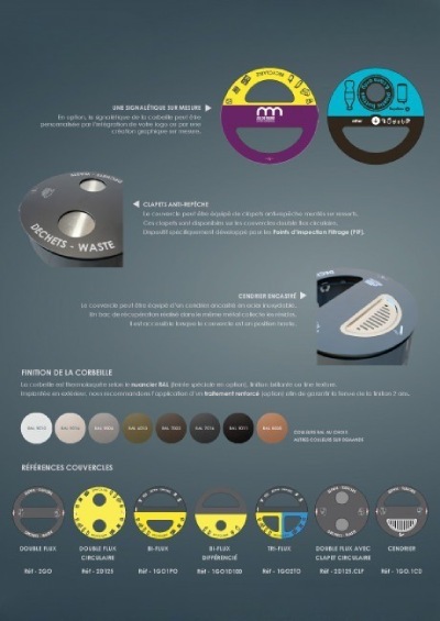 - En acier zingué peint et composée d’un corps et de deux enjoliveurs - Corps composé de 44 tiges cintrées de diamètre 10 mm, d’un socle, de deux flasques en parties basse et haute d’épaisseur 4 mm et de deux porte sacs articulés d’épaisseur 4 mm. Collecte frontale