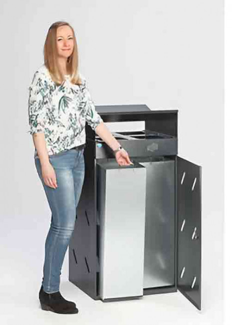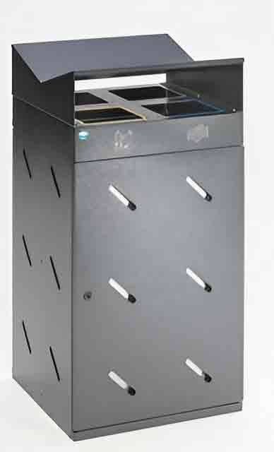 Cette station tri sélectif quadruple dispose de 4 pieds réglables pour un ajustage simple et d’une fermeture à serrure triangulaire.
