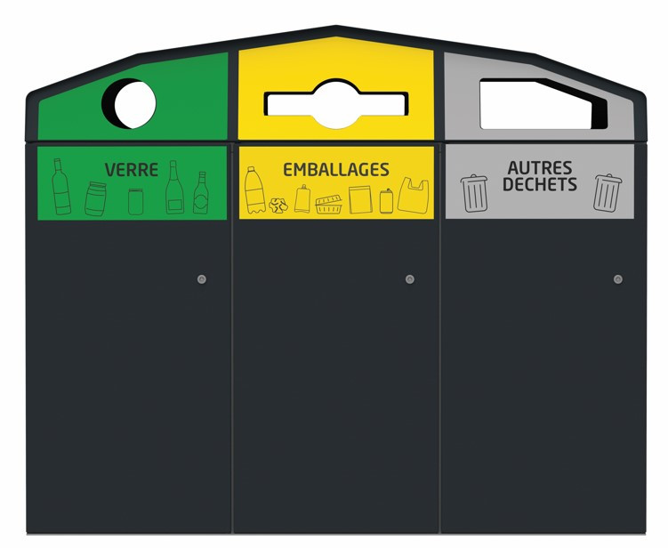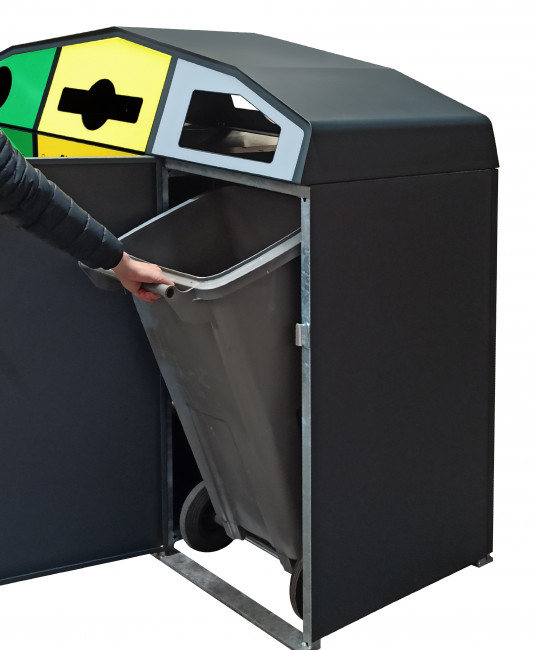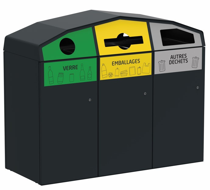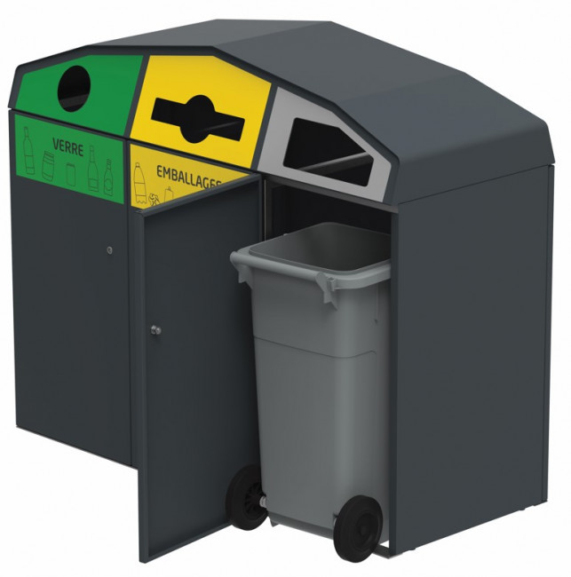 Abri pour bacs de poubelle conçu pour abriter et stocker trois bacs à roulettes utilisés pour la collecte des déchets.