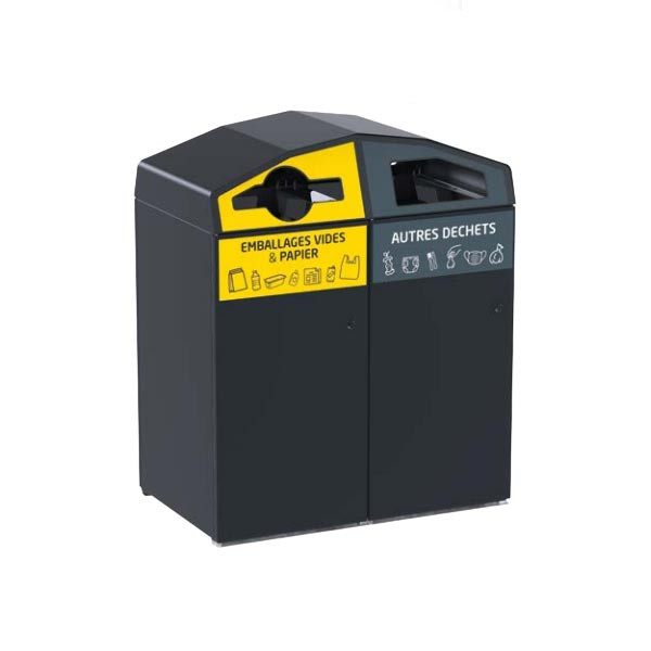 Notre poubelle 2 conteneurs de tri sélectif en acier est un point de tri 2 flux permettant de séparer deux flux de déchets dans un même équipement.
