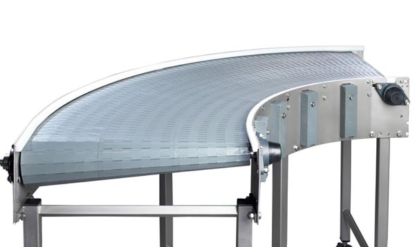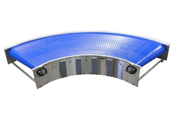 Ce convoyeur à courbe avec un tapis à panneaux en plastique solide est un matériel de manutention conçu pour relier des convoyeurs droits.