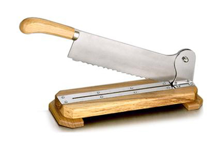 Ce Coupe pain à tranchoir est fixé sur un socle et muni d'une poignée en bois massif (bois de l'hêtre).