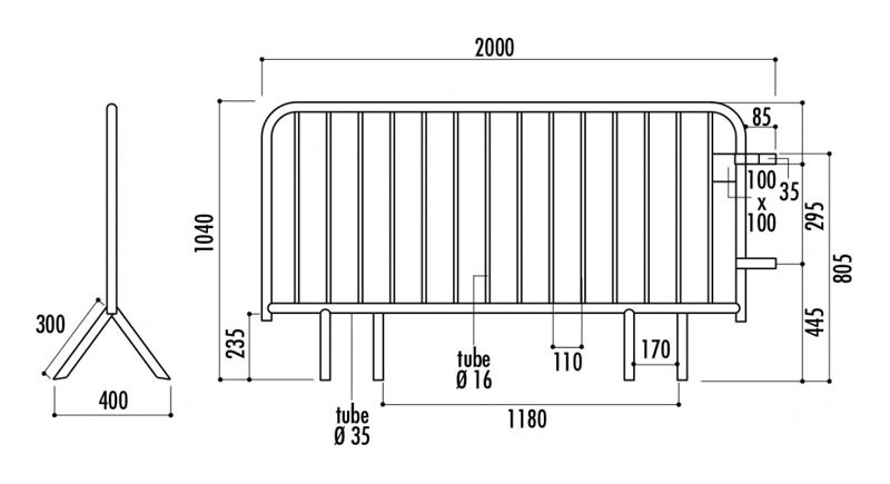 Barrière de police acier galvanisé - 14 ou 18 barreaux - L. 2000 ou 2500 mm