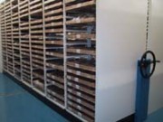 . 1 rangée mobile double face, largeur 1070 mm (430 + 640 mm), de 3 travées de 1650 mm, 15 tiroirs de 55 mm en partie basse + 10 niveaux de tablettes + tablette de couverture, et 2 travées de 1650 mm, de 15 tablettes + tablette de couverture
