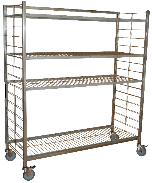Rayonnage mobile: - 2 ou 3 niveaux - Hauteur max. : 1m90 - L x l : 80x80 - Grilles sur les côtés pour protéger les produits