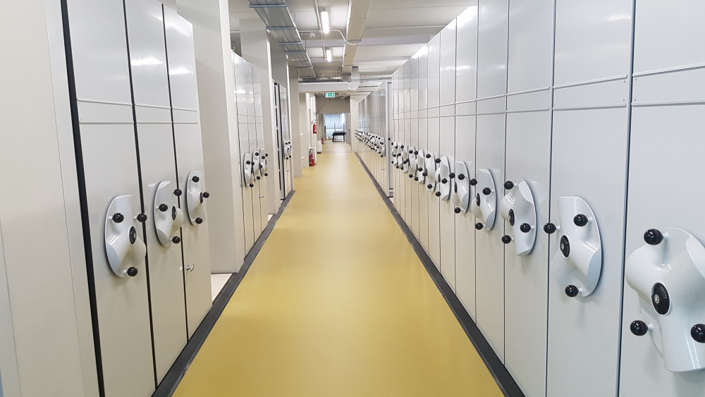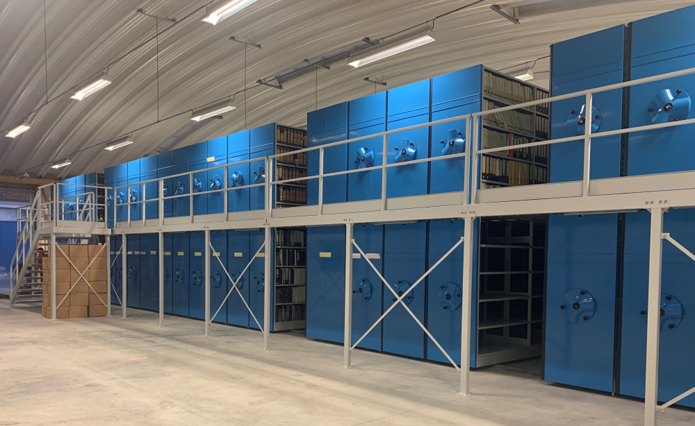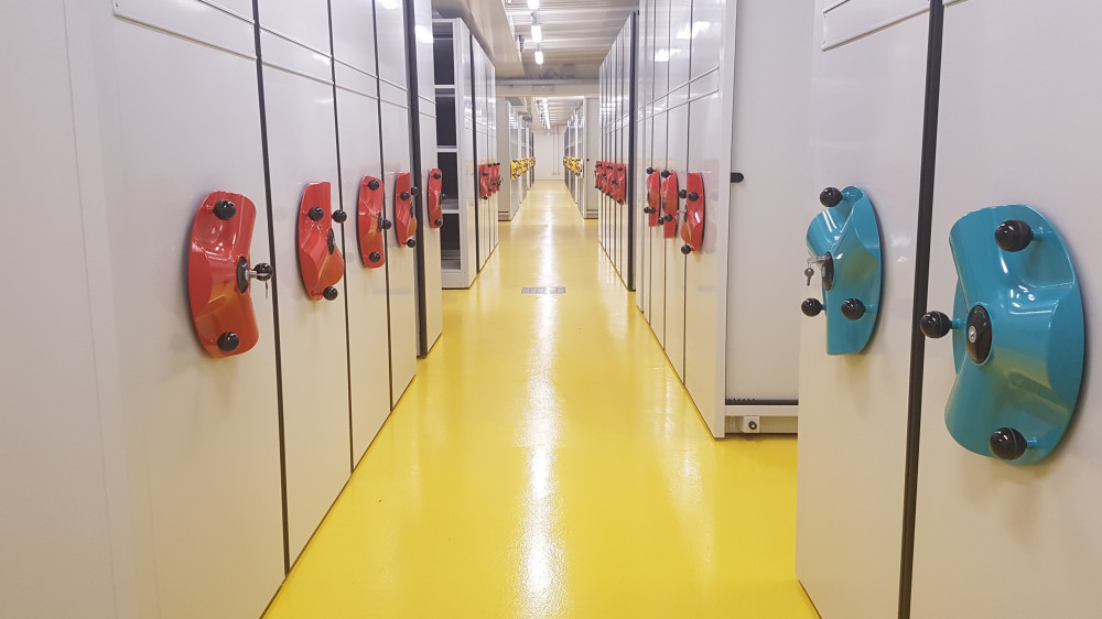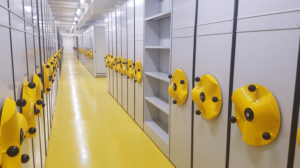 Le système repose sur des bases mobiles qui se déplacent sur rails, permettant une grande capacité de stockage dans un encombrement réduit.