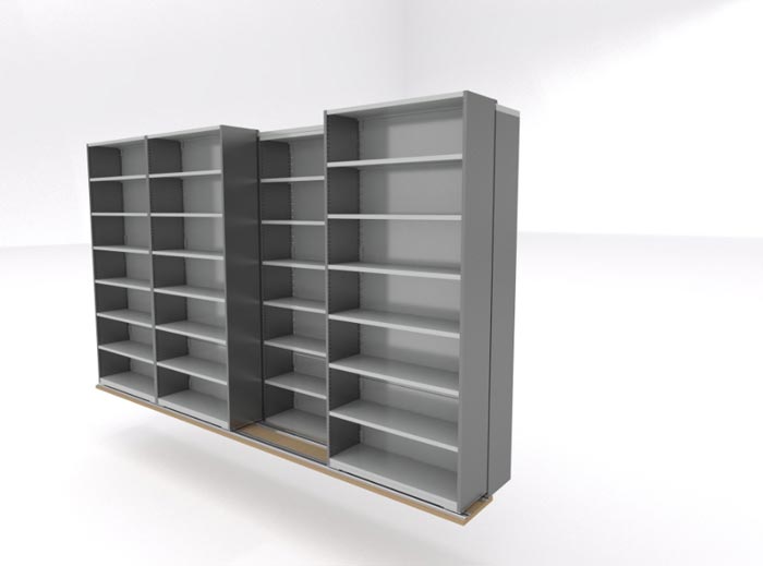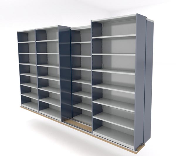 - Les rayonnages sont positionnés l'un devant l'autre pour un gain de place,