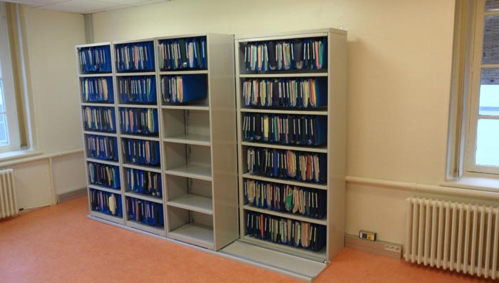 Deux à trois modules de rayonnage latéral tôlé sur-mesure pour un local d"archives d"architecture.