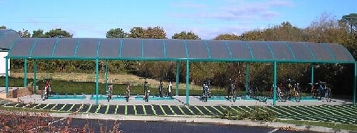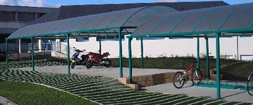 A bardage en polycarbonate ou en verre sécurit, ce parking à vélo convient dans lieux publics.