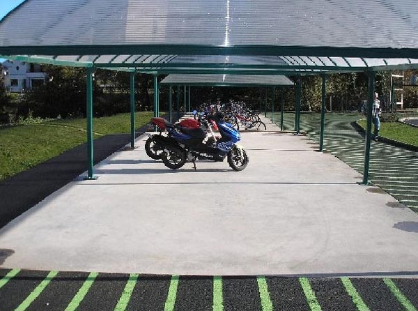 Abris 2 roues de 5 x 15 m Ossature métallique, avec bardage du fond et deux côtés.