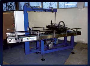 - L'operateur au moyen de la potence relève les 2 rangées de bouteilles et les posent sur la table. ( les commandes sont à portée de main grâce à des switchs).