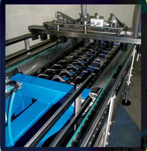 - Les bouteilles sont relevées automatiquement grâce à 2 vérins, sont évacuées sur les 2 convoyeurs et alimentent la chaine d'habillage.