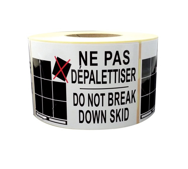 L’étiquette grand format « Ne pas dépalettiser / Do not break down skid » est conçue pour signaler qu’une palette ne doit pas être démontée ou séparée de son contenu d’origine.