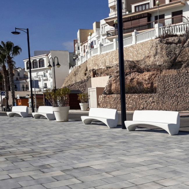 Longueur : 2700 mm Hauteur d'assise : 450 mm Béton Finitions : Blanc, gris, ocre, marron, noir A fixer avec tiges métalliques