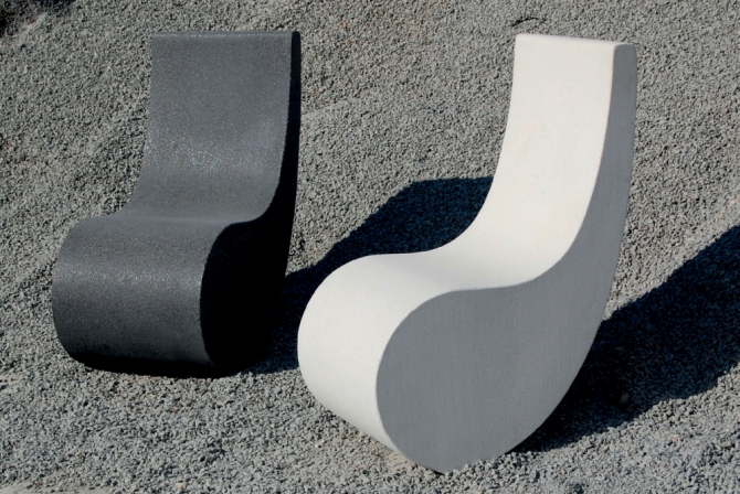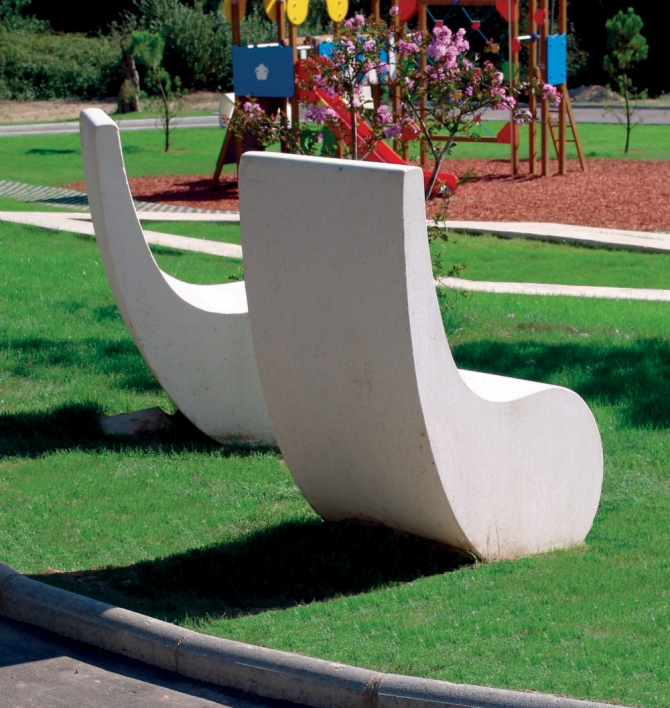 Cette chaise publique en béton est un élément monobloc qui vous invite à faire une pause en cours de route.