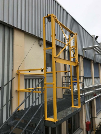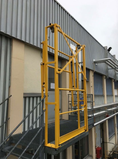 Le garde-corps avant fonctionne selon le principe d'une guillotine et bouge verticalement. Quant au garde-corps arrière, il se replie sur la partie avant et dégage de cette manière en profondeur la surface de la plate-forme. Ainsi, on obtient un sas de sécurité efficace pour la prévention des risques et conforme à la législation.