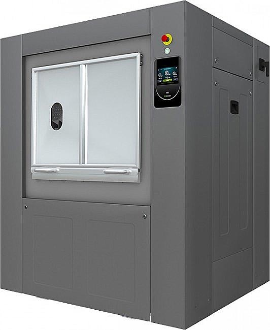 Une laveuse essoreuse barrière conçue pour le traitement du linge en hôpital, avec une partition Pullman du tambour