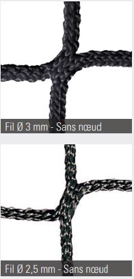 Le filet est réalisé en fil PPM sans nœud, avec un diamètre de 2,5 mm pour la version à tension par cordeaux et de 3 mm pour la version à tension par câble.