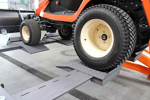 - Support de la charge par 4 rampes d'accès, 370 x 350 mm, réglables pour de différents voies et empattements, également pour des véhicules à 3 roues