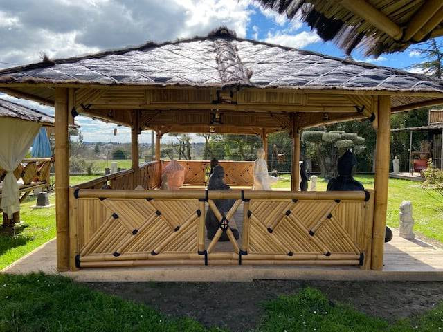 Avec sa structure en bambou naturel, sa toiture étanche et ses barrières décoratives, notre tonnelle vous permet de créer un cadre exotique et fonctionnel.
