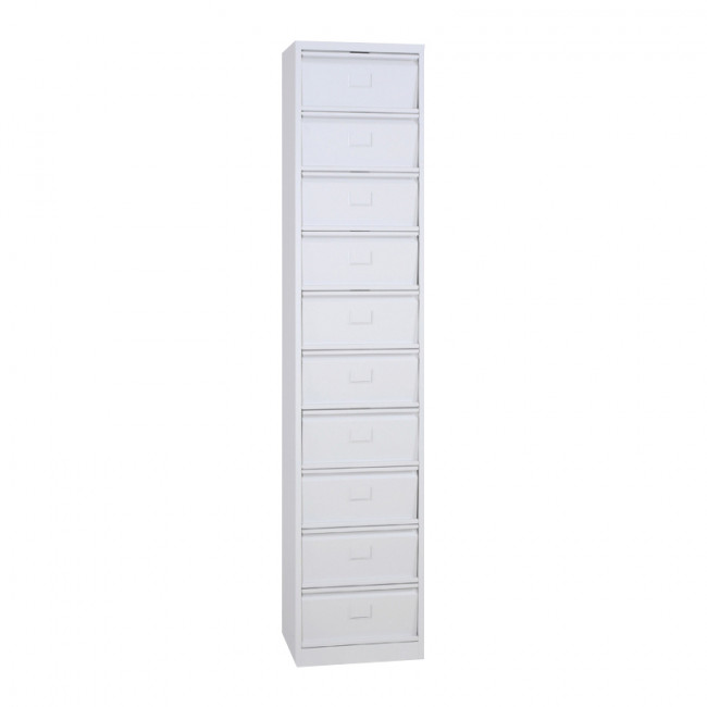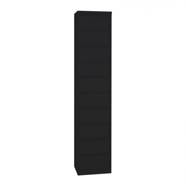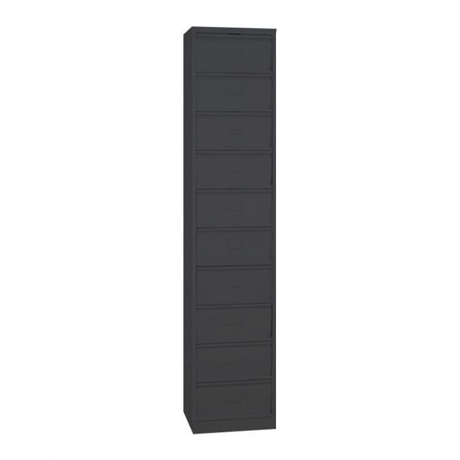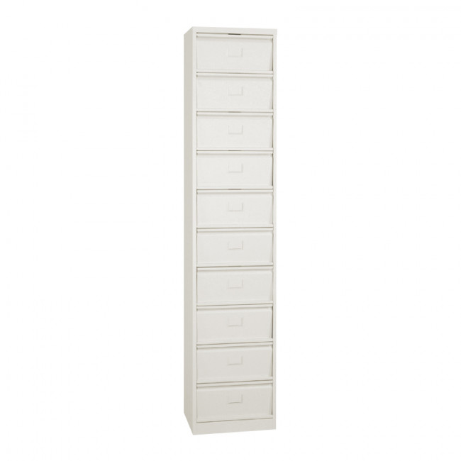 Colonne à 10 clapets : dimensions L.41 x P.35 x H.198 cm, parfaite comme armoire de classement principale dans un espace d’archives ou un couloir.
