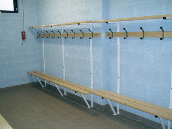 Ce banc mural avec porte paquets est adapté pour les vestiaires.