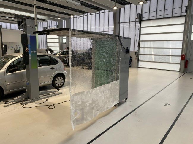 Les pièces sont placées dans la zone de travail de la cabine peinture mobile pliable et peut également être amenée dans une zone spécifique ou la voiture et placé.