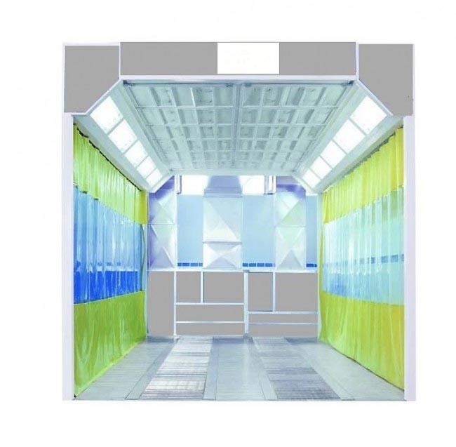 Unité de «préparation de peinture» avec canaux d'air, fonctionnant sous basse pression, dans laquelle est effectuée les opérations de pré-peinture du véhicule. L'air est éjecté hors de l'installation grâce à un système de filtrage.